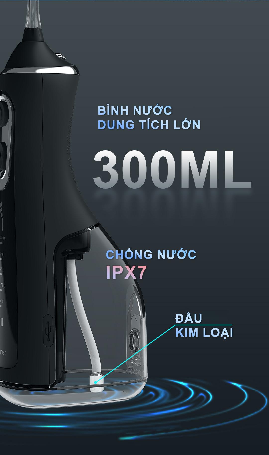 - Thể tích bình nước 300 ml, đủ để vệ sinh nguyên hàm răng trong 1 lần sử dụng. Có thể pha thêm nước súc miệng vào trong bình nước, để tăng hiệu quả vệ sinh.